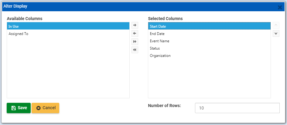 2. Use the following controls to move columns from the Available Columns window (columns available but not currently in the grid) to the Selected Columns window (columns currently displayed in the grid) and vice-versa: