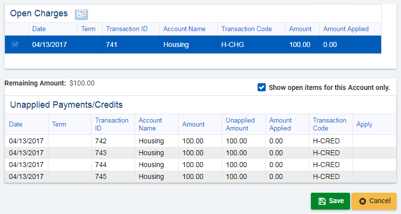 For example: In the following screenshot, the charge is in the Housing Account but the unapplied payments are in the Cash-Payment account. The unapplied payments are displayed because the Show open items for this Account only option has been unchecked.