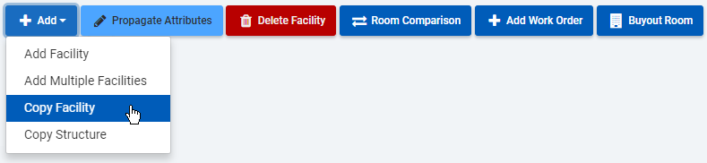 3. With a facility selected, click the Add drop-down menu, and select Copy Facility. The Copy Facility screen is displayed.