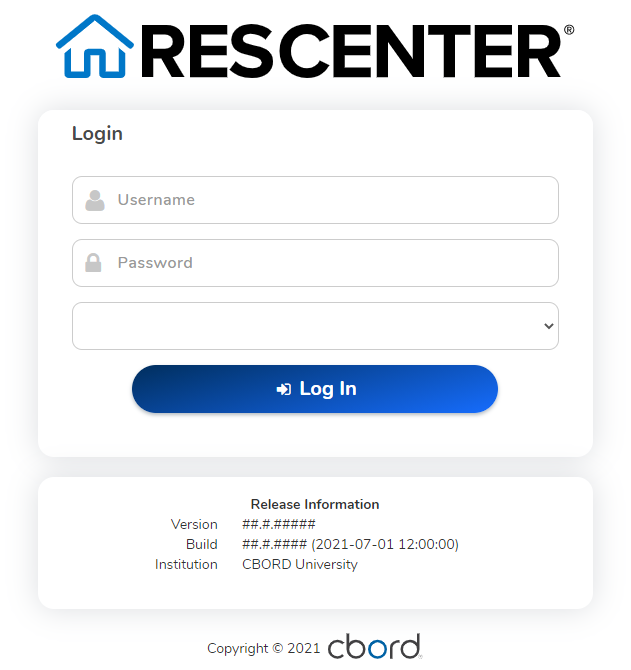 From anywhere in ResCenter, a user can view the current version of ResCenter installed. The footer of ResCenter features the current version number and build number. This information may be useful when contacting CBORD Support for help with an issue with your version of ResCenter.