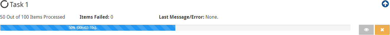 When a task is in progress and the no errors have occurred, a blue task progress bar will be displayed. The progress bar will indicate what percentage of the task items are complete and the estimated time remaining until all task items are completed. A processing icon will be displayed next to the task’s name indicating the task is currently in progress. The Items Failed section will display 0, and the Last Message/Error section will display None.