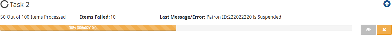 When a task is in progress and at least one error has occurred, an orange task progress bar will be displayed. The progress bar will indicate what percentage of the task items are complete and the estimated time remaining until all task items are completed. A processing icon will be displayed next to the task’s name indicating the task is currently in progress. The Items Failed section will display the number of items failed thus far, and the Last Message/Error section will display the reason the last failed item did not process successfully.