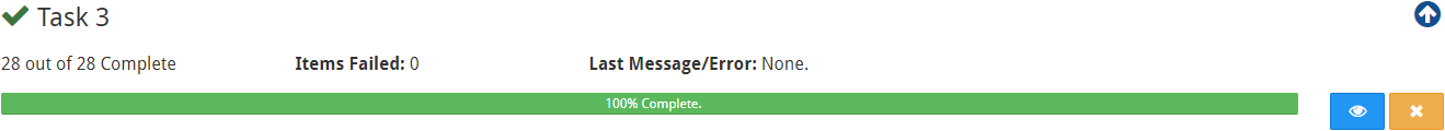When all items in a task have been completely processed without errors, a green task progress bar will be displayed. A green check mark will also be displayed next to the task’s name indicating the task was successfully completed. The Items Failed section will display 0, and the Last Message/Error section will display None.