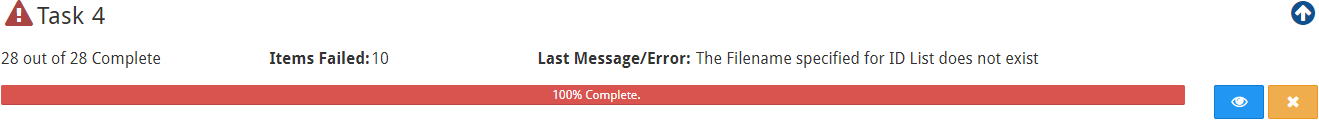 When all items in a task have been completely processed and at least one error has occurred, a red task progress bar will be displayed. A red alert icon will be displayed next to the task’s name indicating the task encountered at least one error. The Items Failed section will display the number of items which failed, and the Last Message/Error section will display the reason the last failed item did not process successfully.